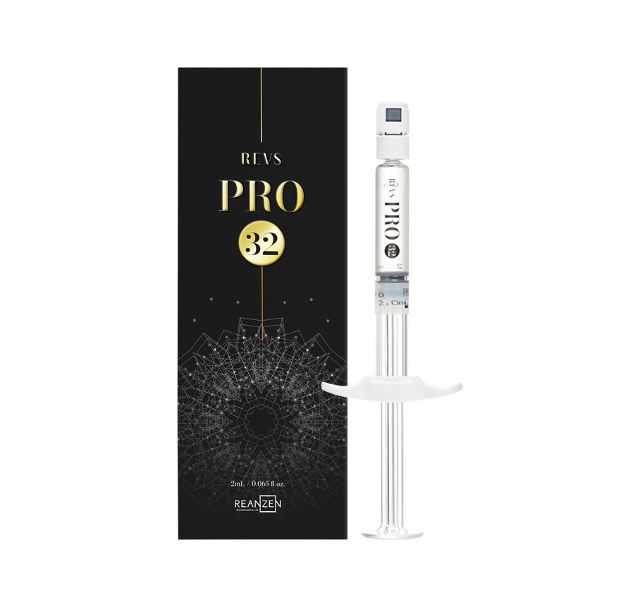 Revs PRO32 is a skin booster with a 64mg concentration of Hyaluronic Acid (like PROFHILO) 32mg high molecular weight HA and 32mg low molecular weight HA.